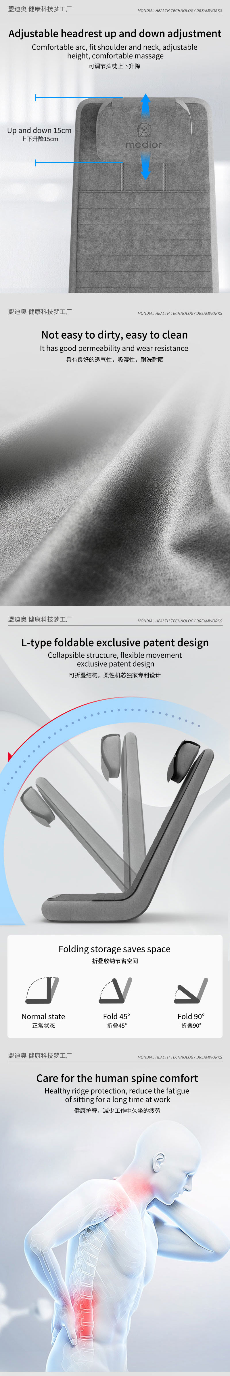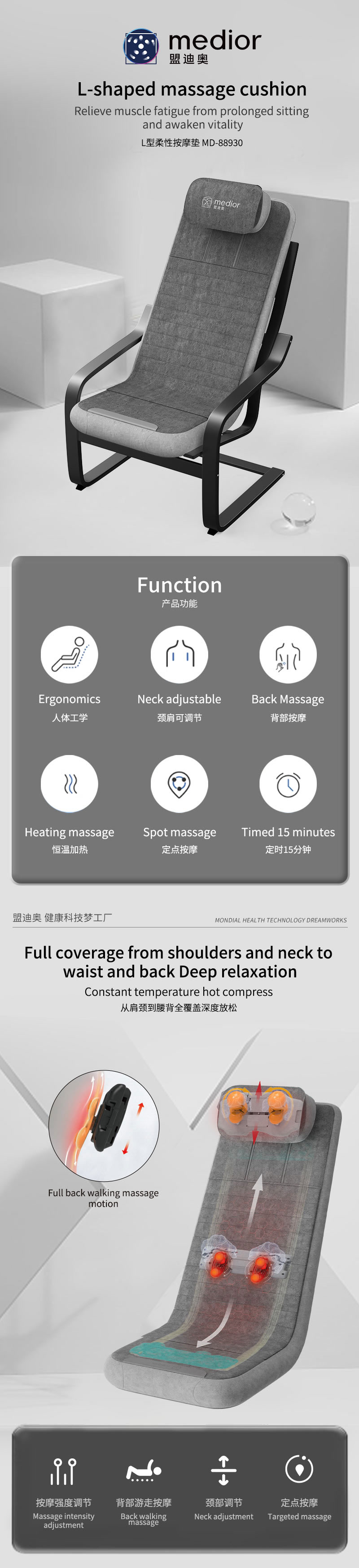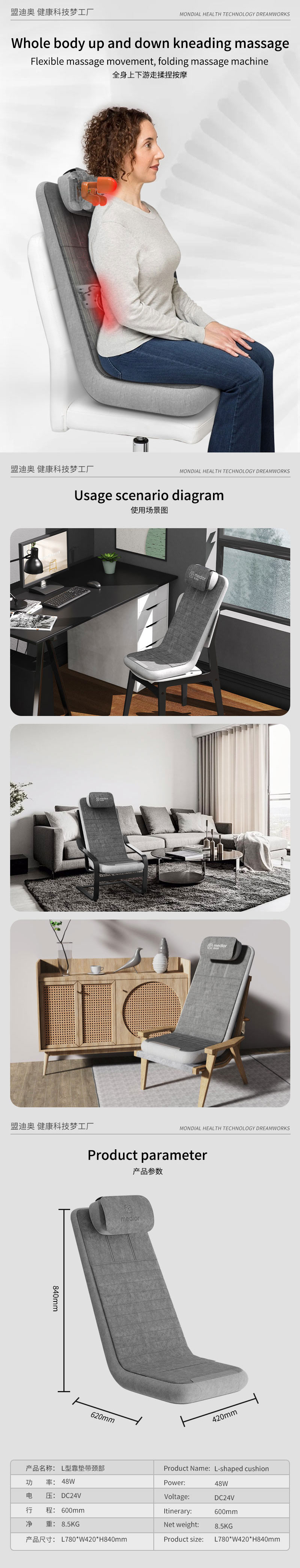 1、L型機(jī)芯結(jié)構(gòu),對(duì)折包裝縮小體積2、獨(dú)家專(zhuān)利柔性機(jī)芯3、力度三檔調(diào)節(jié),定點(diǎn)按摩,腰背按摩、臀腿按摩、全背按摩模式選擇4、背部行走揉捏,按摩區(qū)域加長(zhǎng)到從肩膀到大腿;5、更加貼合不同款式的椅子整體可對(duì)折收納
