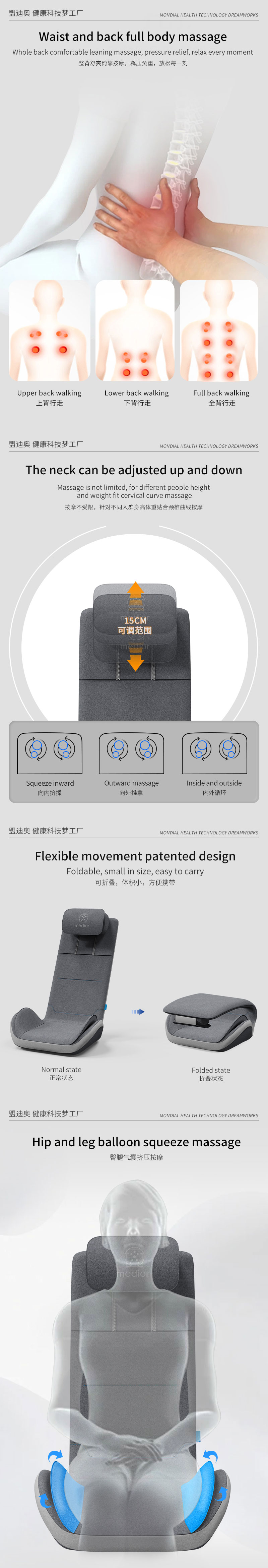 1、L型機芯結構,對折包裝縮小體積2、獨家專利柔性機芯3、力度三檔調節(jié),定點按摩,腰背按摩、臀腿按摩、全背按摩模式選擇4、背部行走揉捏,按摩區(qū)域加長到從肩膀到大腿;5、更加貼合不同款式的椅子整體可對折收納