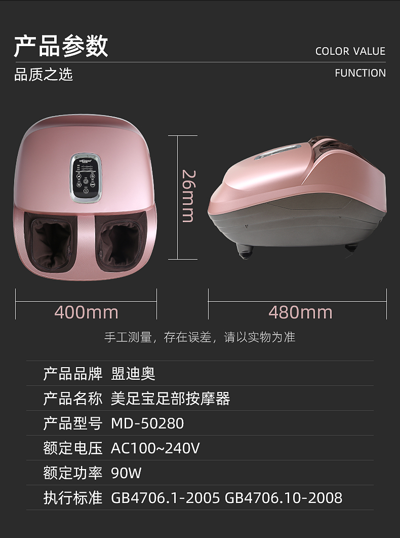 震動頻率:1000次/分(高檔時,加熱按摩頭表面溫度:40-55℃